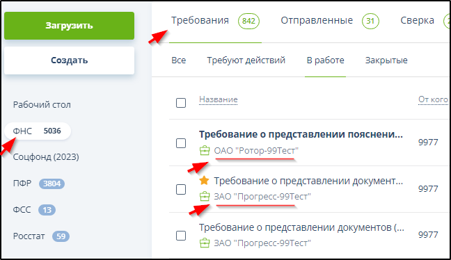 Для удобства работы представителей налогоплательщиков в подразделе "ФНС" - "Требования" в графе "Название" указано, какому налогоплательщику адресовано каждое из требований. Пример: