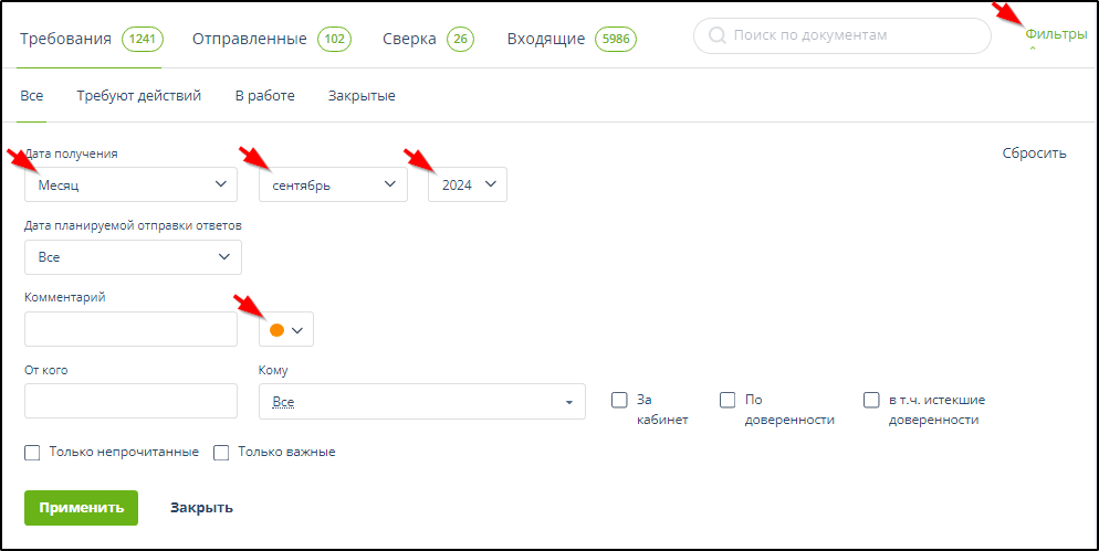 В подразделе "Все" можно осуществить поиск среди всех полученных требований. В качестве параметра поиска можно использовать часть названия, КНД, комментария. Для использования в качестве параметров поиска имени отправителя, даты или периода отправки, цвета комментария, признака важности и признака прочтения нужно: