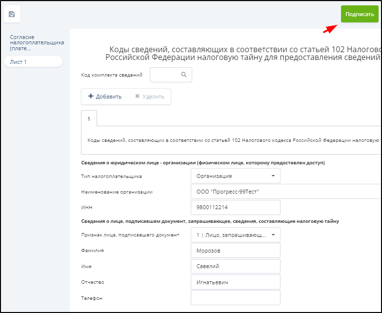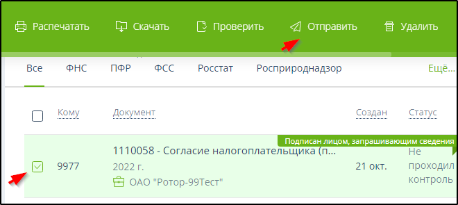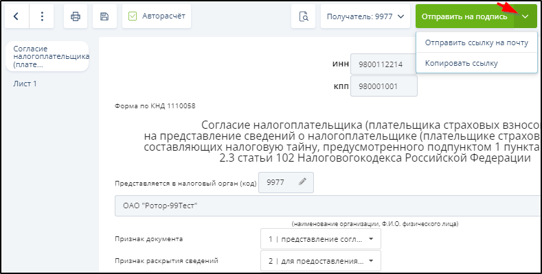 После заполнения и проверки документа КНД 1110058 для получения подписи лица, которому раскрываются сведения, составляющие налоговую тайну, следует воспользоваться меню Отправить на подпись . Пример: