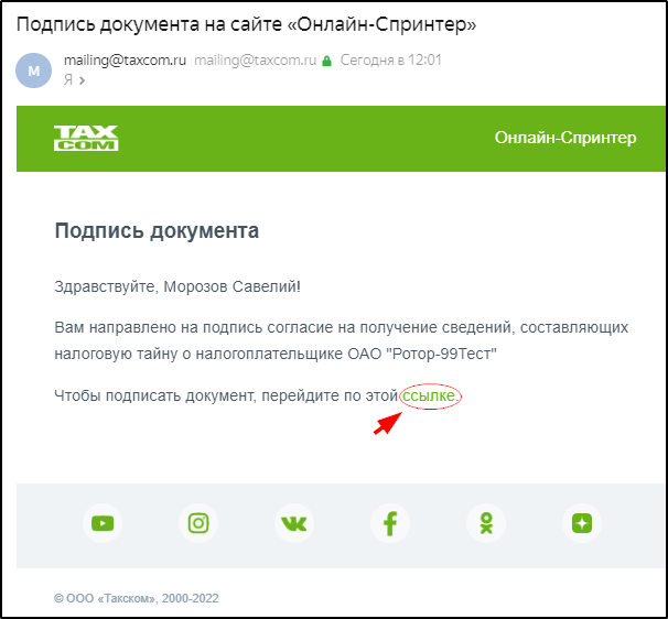 Для подписания получателю потребуется перейти по полученной ссылке и использовать ключ ЭП организации или физического лица, указанного в КНД 1110058 на листе 1. Пример:
