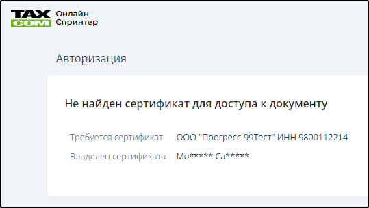 При любом различии, даже в одном знаке или пробеле, данных организации и/или лица, указанных на листе 1 документа КНД 1110058 с данными сертификата ключа ЭП лица, которому раскрываются сведения, после перехода по полученной ссылке документ о согласии (КНД 1110058) не откроется, отобразится сообщение об отсутствии сертификата для доступа к документу. Пример: