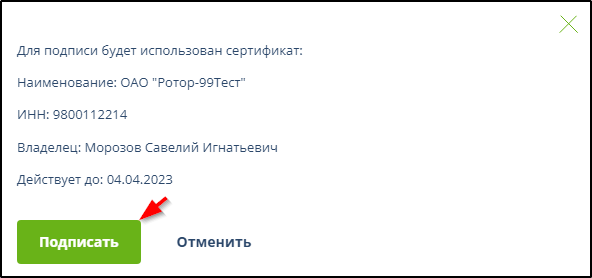 Если на компьютере установлен сертификат ключа ЭП, необходимый для подписания документа, то после перехода по полученной ссылке откроется документ КНД 1110058. После ознакомления с этим документом вашему контрагенту следует нажать кнопку Подписать над документом и под сообщением об использовании сертификата. Пример: