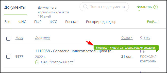 В результате этого подпись лица, которому раскрываются сведения, будет прикреплена к документу КНД 1110058, который находится в разделе "Черновики", и у этого документа появится комментарий Подписан лицом, запрашивающим сведения . Пример: