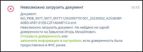 Если в имени импортируемого файла ИНН организации-отправителя не совпадает с указанным в подразделе "Настройки и реквизиты" - "Общие" или ФИО подписанта в импортируемом документе не соответствует ФИО руководителя организации и ФИО доверенных лиц в имеющихся в системе доверенностях, то документ не импортируется, в Журнале уведомлений формируется запись о невозможности загрузки документа. Пример:
