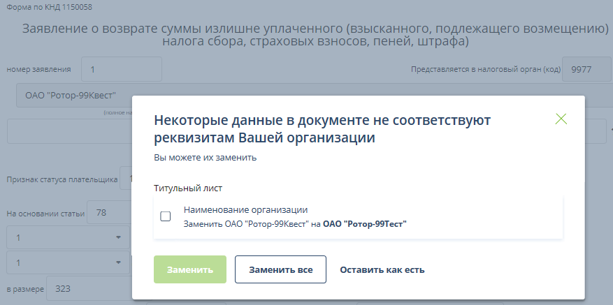 Если некоторые реквизиты организации-отправителя в импортированном документе не соответствуют указанным в разделе "Настройки и реквизиты", то при первом открытии документа отобразится окно с предложением заменить (исправить) реквизиты. Пример: