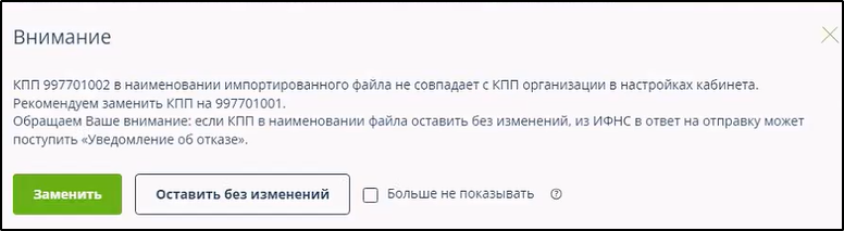 Если пользователь не является налоговым представителем и КПП в импортируемом файле отличается от указанного в реквизитах (в разделе "Настройки и реквизиты" - "Отчётность" - "Реквизиты"), то открывается окно с предложением заменить КПП при импорте. Пример: