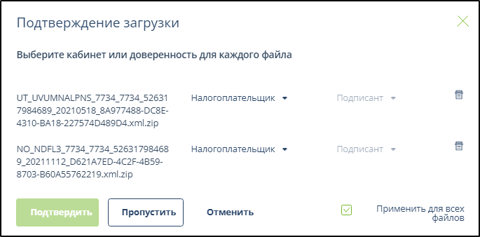 Если необходимо выбрать разных подписантов для загружаемых документов, то необходимо в этом окне сначала убрать галочку в позиции "Применить для всех файлов".