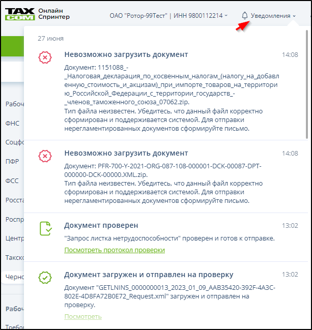 Сообщения об удачной или неудачной загрузке и проверке сохраняются в Журнале уведомлений, их можно посмотреть, если открыть этот журнал с помощью кнопки "Уведомления". Пример: