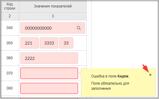 Справа от полей с ошибками отображаются подсказки с сообщениями об ошибках. Эти подсказки закрываются нажатием на кнопку "х" в правом верхнем углу поля подсказки.