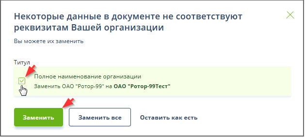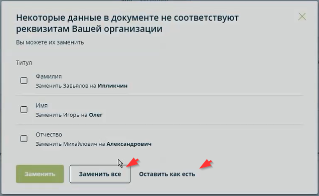 Для выборочной замены реквизитов значениями из раздела "Настройки и реквизиты" следует отметить галочками реквизиты, которые нужно исправить, и нажать кнопку "Заменить".