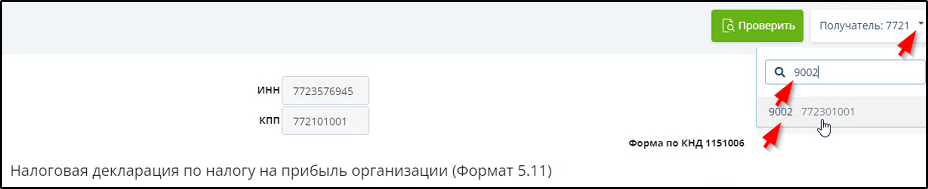 в правом верхнем углу окна в позиции "Получатель". Если список допустимых кодов ИФНС и КПП большой, то можно воспользоваться полем поиска над списком - ввести в этом поле код ИФНС или КПП. Пример: