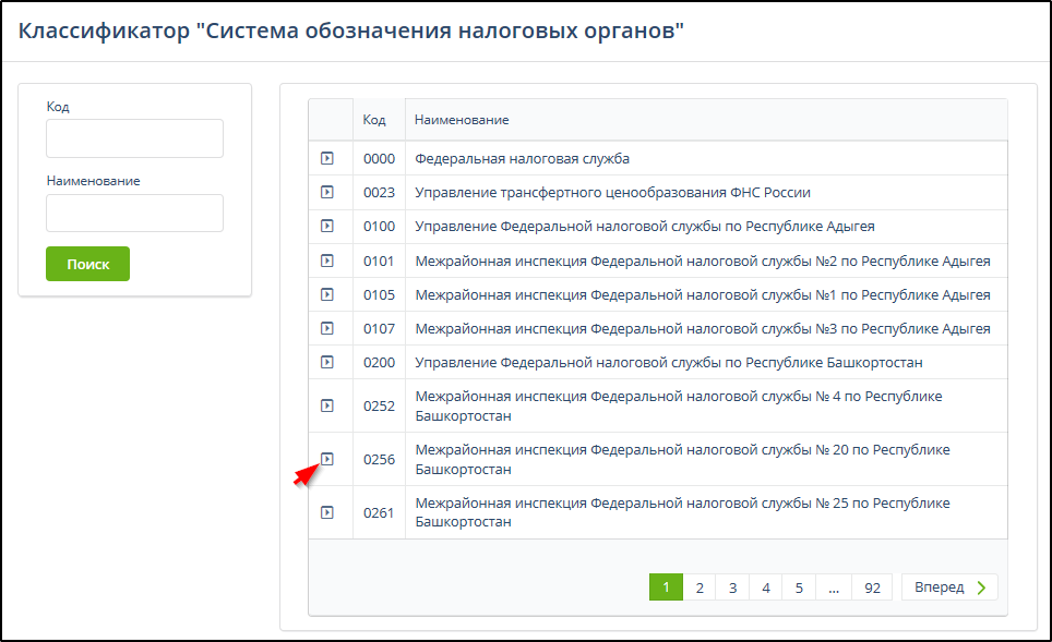 выбрать необходимый код ИФНС в открывшейся таблице классификатора "Система обозначения налоговых органов":