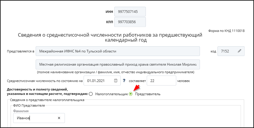 Для указания в качестве подписывающего лица уполномоченного представителя налогоплательщика следует выбрать значение "Представитель". В случае выбора в качестве лица, подписывающего документ, представителя налогоплательщика при отправке документа будет автоматически сформирован и отправлен файл со сведениями о доверенности, на основании которой он имеет право подписания документов.