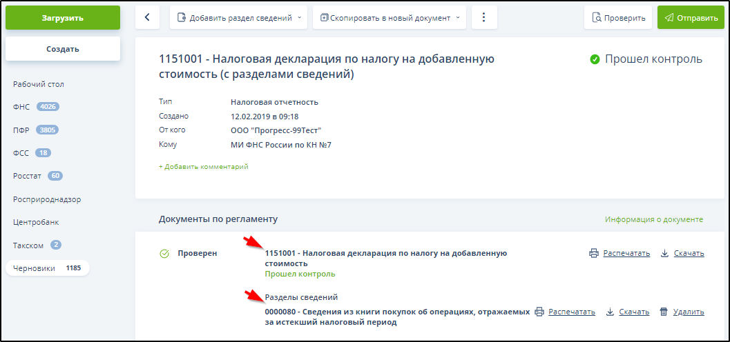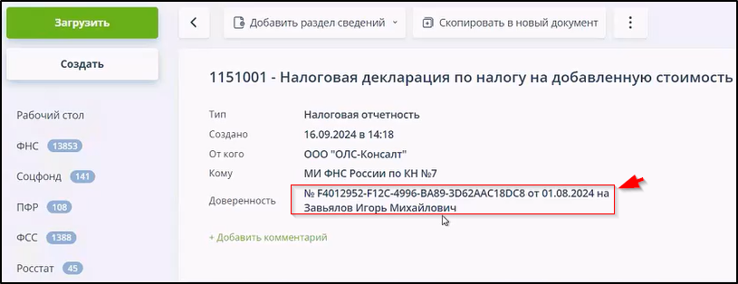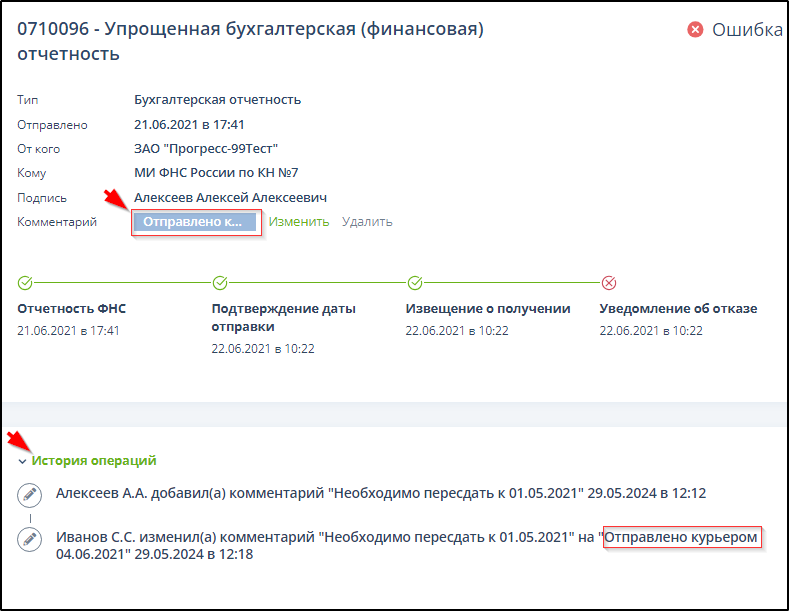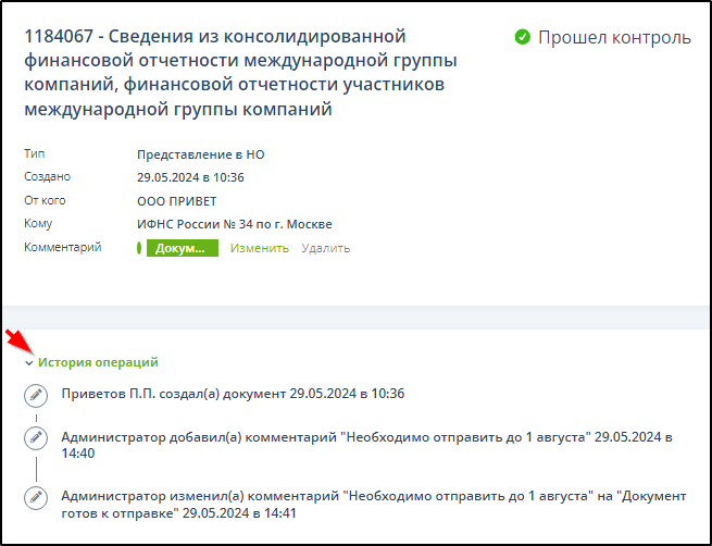 После отправки документа комментарий будет отображаться в подразделе "ФНС" - "Отправленные" и на странице ЭДО в поле "Комментарий" и в блоке "История операций". Примеры: