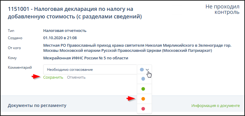 Выбрать цвет значка комментария в списке документов. Пример: