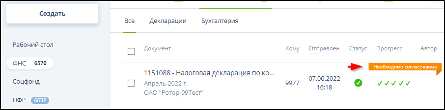 Каждому сформированному документу соответствует строка таблицы, содержащая: наименование получателя, тип отчетности, тип документа, дату создания (импортирования), сведения о проверке на соответствие установленному формату (статус) и комментарий, если он был введен. Если при входе в систему автором документа использовался сертификат открытого ключа ЭП, то в строке документа указывается его фамилия и имя.