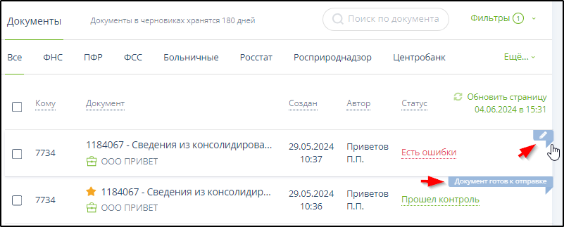 Если по какой-либо причине работу по подготовке документа нужно приостановить, пользователь может сохранить черновик документа в разделе "Черновики" и возобновить работу с этим документом позже. Документ может храниться в разделе "Черновики" до 180 дней.