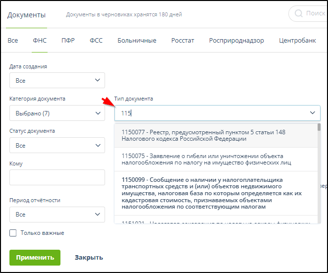 Для отбора документов с заданным КНД необходимо начать набор КНД, наименования документа или просто щелкнуть мышью в поле "Тип документа", в результате откроется меню для выбора типа документа в качестве параметра фильтра. Пример:
