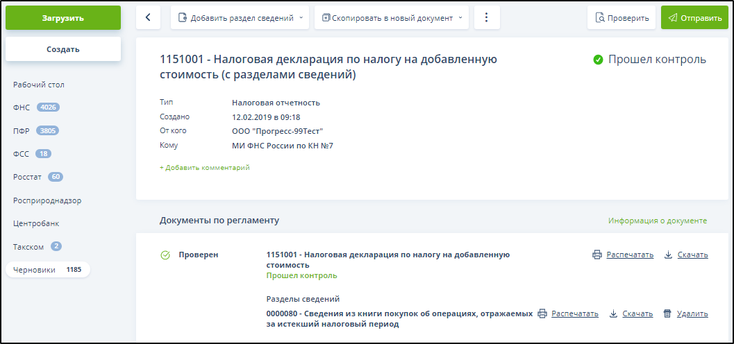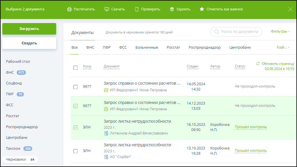 После выделения документа (документов) галочкой (галочками) в верхней части окна откроется зелёная панель инструментов, которая содержит кнопки: "Распечатать", "Скачать", "Проверить", "Отправить" (эта кнопка доступна только в случае входа по сертификату ключа ЭП), "Удалить", "Отметить как важное" или "Отметить как неважное". Пример: