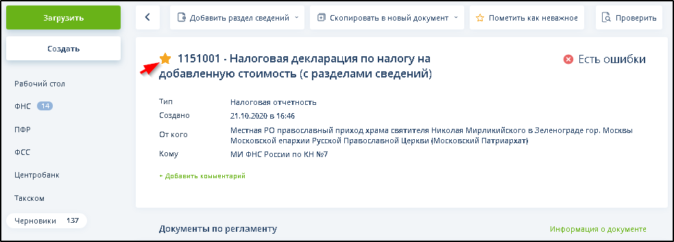 На этой странице при желании можно добавить документ в список документов, заслуживающих отражения в виджете "Налоговый календарь" раздела "Рабочий стол" или удалить документ из этого списка, если он был туда ранее добавлен.