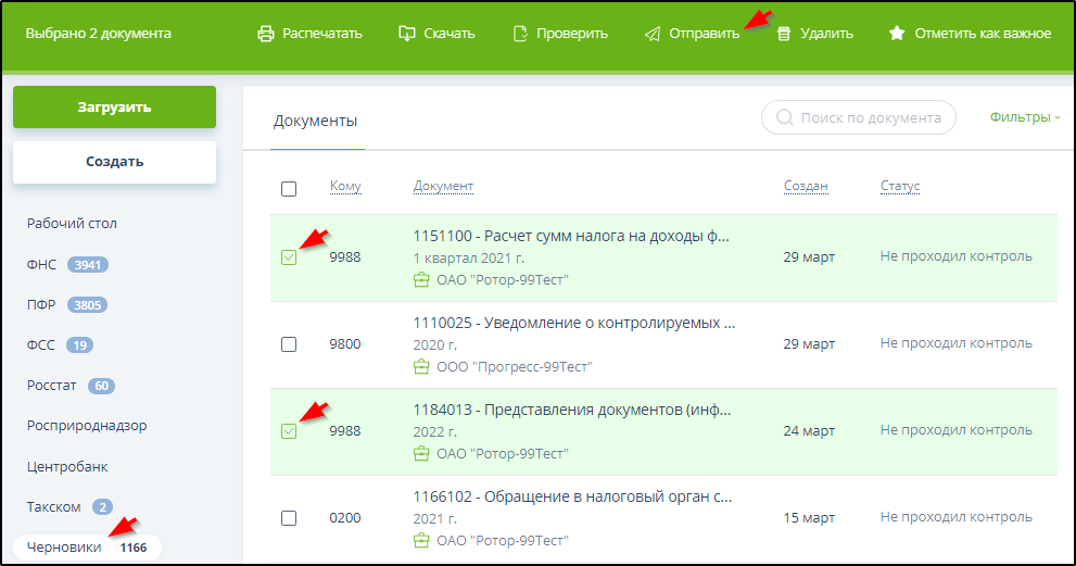 Для отправки документа (документов) из раздела "Черновики" - "Документы" следует отметить его (их) галочкой (галочками) и нажать кнопку "Отправить".