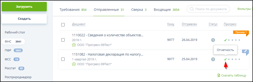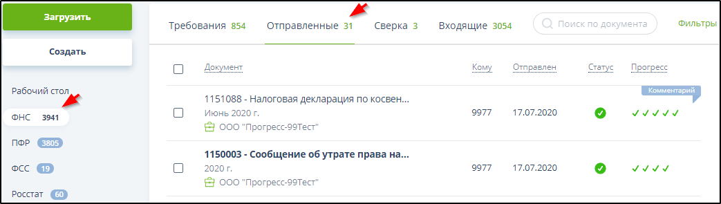 После успешной отправки документа в подразделе "Отправленные" раздела "ФНС" в табличной части появится строка, соответствующая отправленному документу, а в графе "Прогресс" - зелёная галочка. Пример: