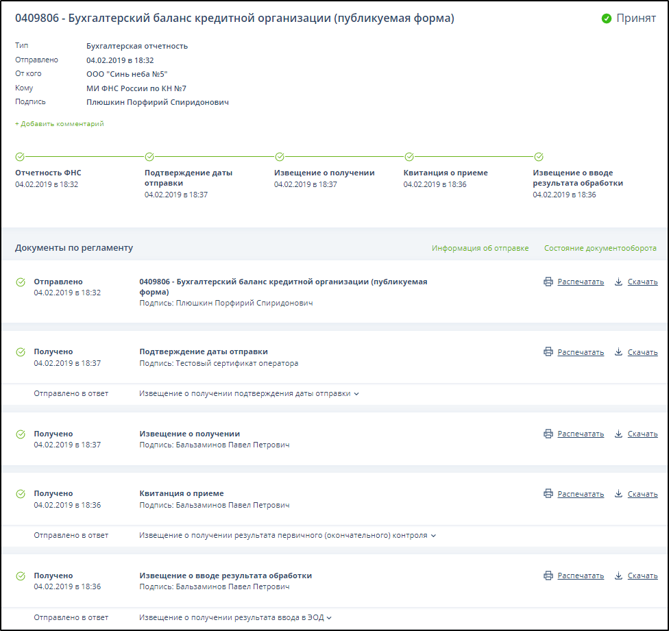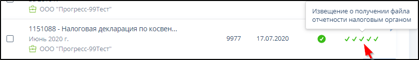 в столбце "Статус" означает, что цикл ЭДО завершен успешно, отправленный документ налоговой или бухгалтерской отчетности принят и введен в базу данных налоговых органов.