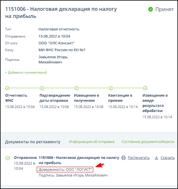 Если документ отправлен по доверенности, то отображается информация об организации или лице, выдавшем доверенность. Пример: