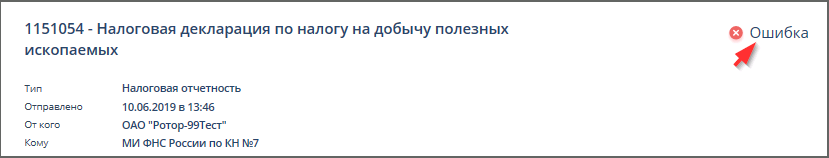 Если при доставке документа налоговой или бухгалтерской отчетности произошёл сбой или налоговым органом были обнаружены ошибки, - справа от названия документа отчётности отображается слово "Ошибка". Пример: