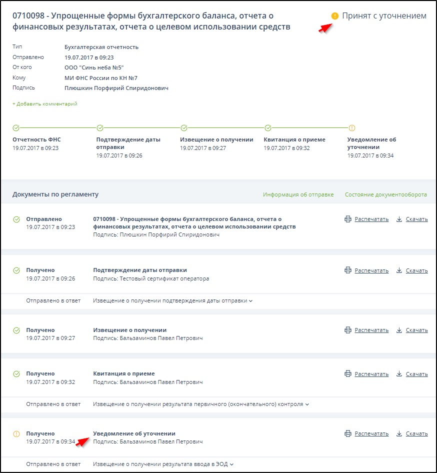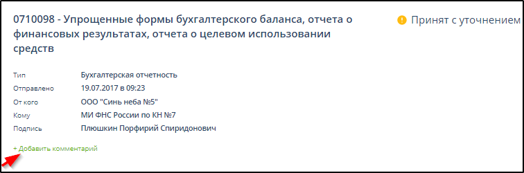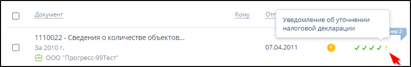 В случае получения уведомления об уточнении справа от названия документа отчётности отображается текст "Принят с уточнением". Пример: