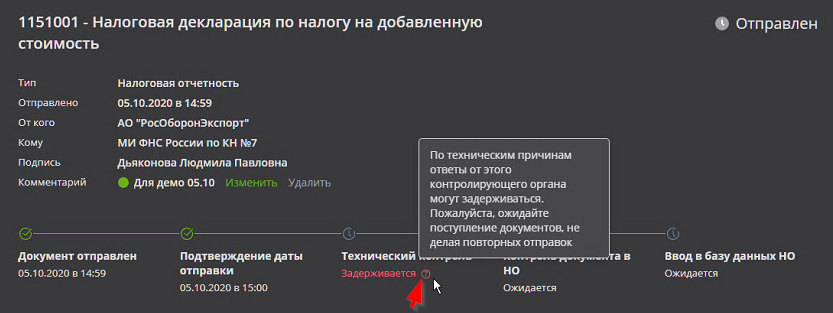 В случае временного отсутствия доступа к серверам ФНС на странице информации об ЭДО появится сообщение о задержке какого-либо ответного сообщения "Задерживается". Пример с сообщением о задержке получения ответных сообщений по причине отсутствия доступа к серверам ФНС. Пример:
