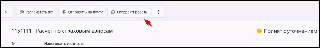 В случае получения от налогового органа уведомления об уточнении или об отказе в приеме для получения копии отклонённого документа в качестве черновика можно нажать кнопку "Скорректировать" на панели инструментов: