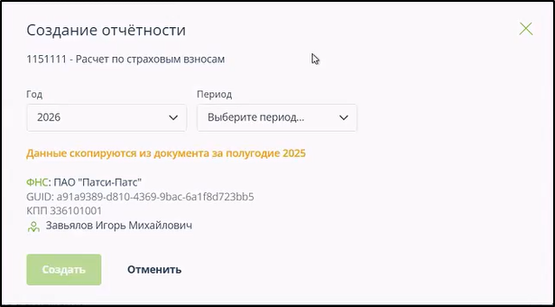 После нажатия кнопки "Скорректировать" открывается окно для выбора года и периода для формируемого документа:
