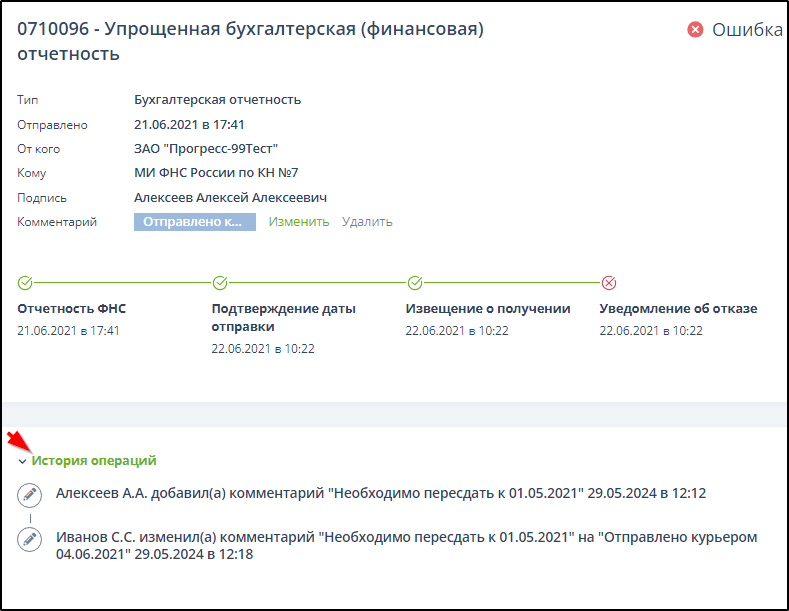 На странице ЭДО щелкнуть левой кнопкой мыши на блоке "История операций". Пример: