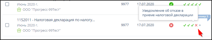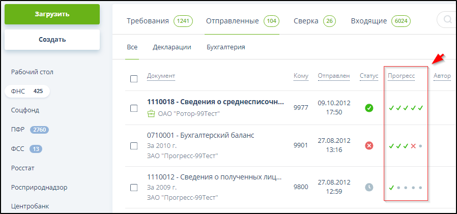 Завершенность цикла ЭДО и результат представления отчетности отображаются значком в колонке "Статус".
