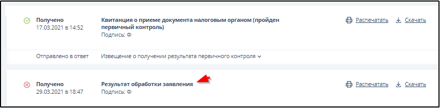 Если Заявление не принято (статус отображается значком