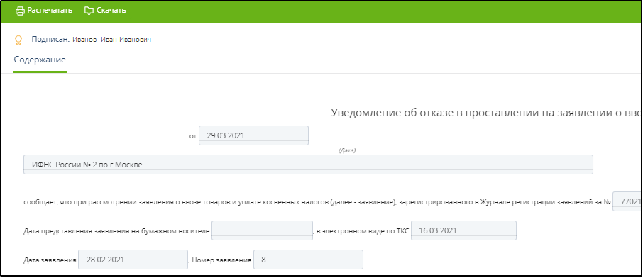 В результате откроется экранная форма сообщения об ошибке или уведомления об отказе. Пример: