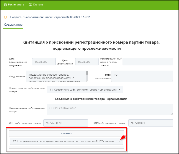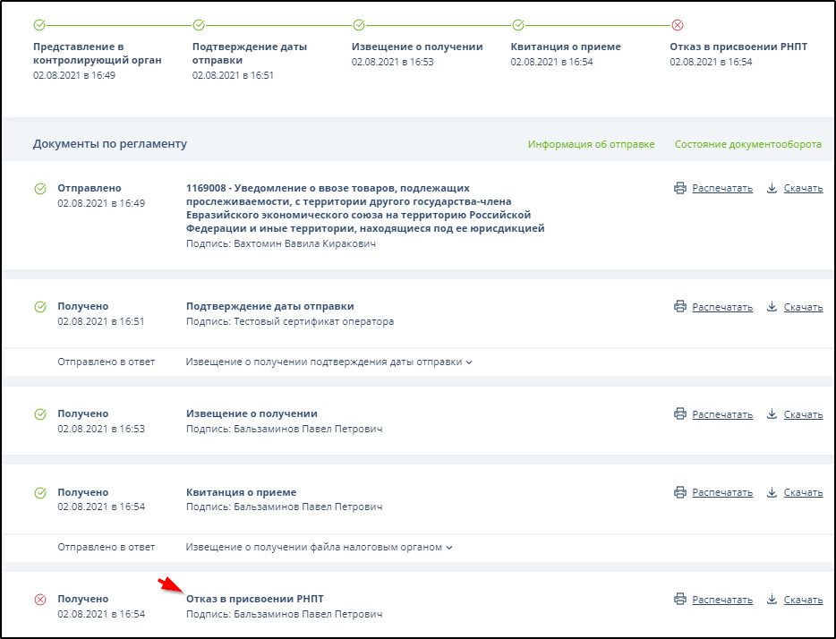 означает, что получено сообщение об отказе в приеме, ошибках или несоответствиях.