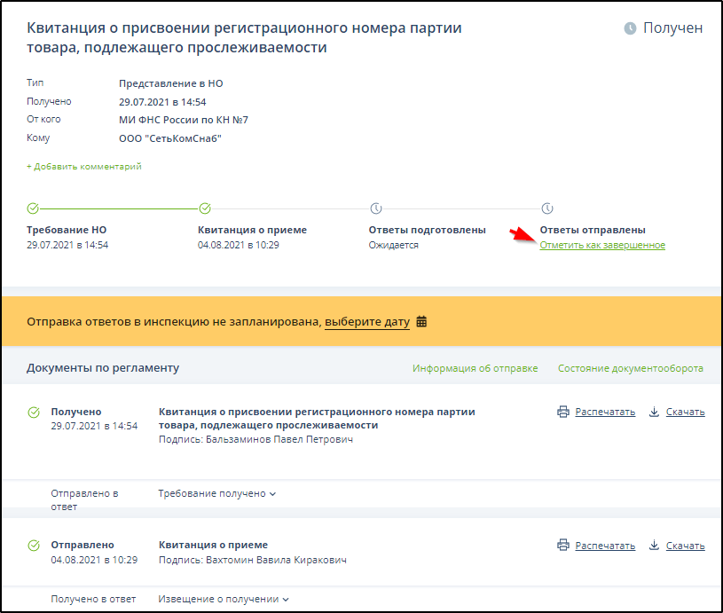 в столбце "Статус" означает, что цикл ЭДО завершен успешно. Для установки такого значка нужно после получения Квитанции о присвоении РНПТ и автоматической отправки квитанции о приеме нажать ссылку Отметить как завершенное. Пример: