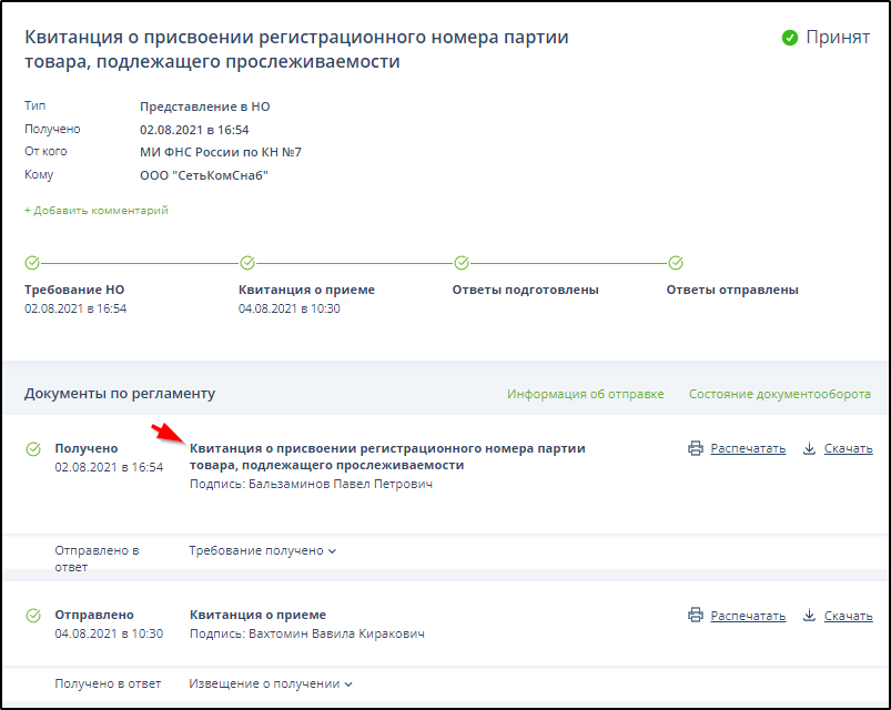 Перейти по ссылке "1169012 - Квитанция о присвоении регистрационного номера партии товара, подлежащего прослеживаемости".