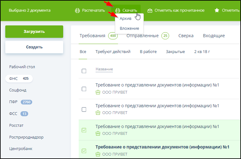 Для скачивания всех файлов требования (требований) вместе с подписями в виде архива следует отметить галочкой требование (требования) в списке раздела "ФНС" - "Требования" и воспользоваться пунктом "Архив" в меню "Скачать" на панели инструментов. Пример: