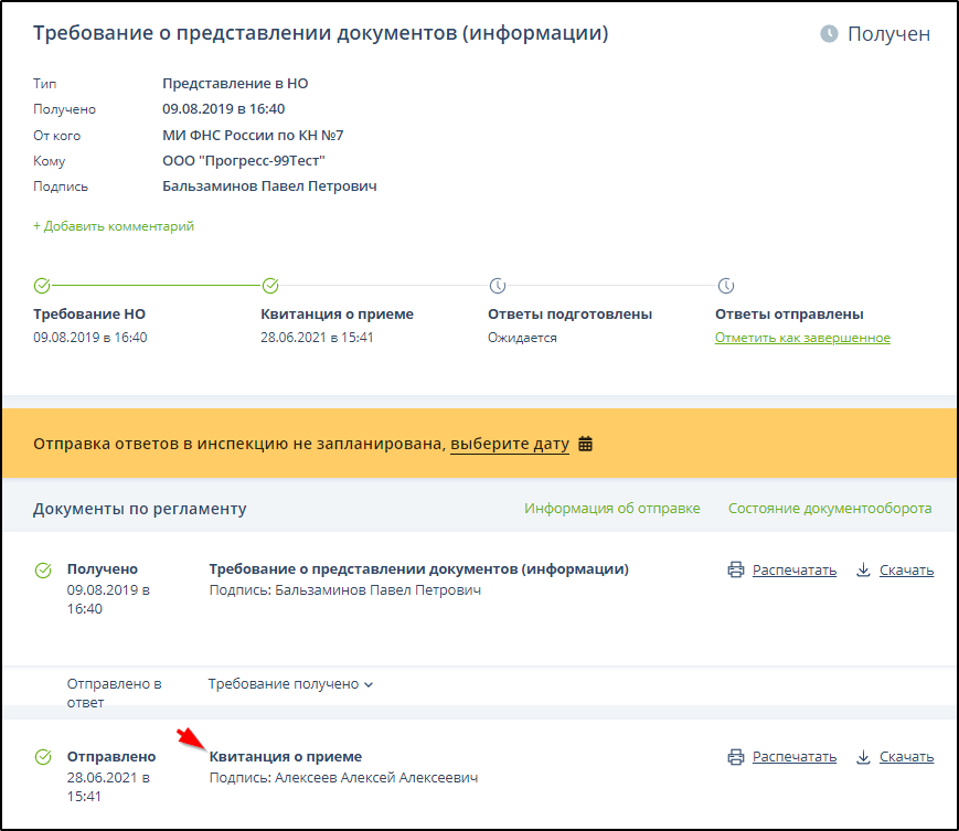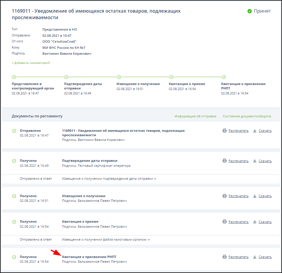 Через несколько секунд после отправки уведомления о получении (квитанции о приеме) отображается информация о его отправке. Пример: