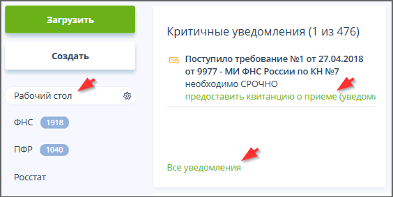 Для подготовки ответа или отправки квитанции о приёме сначала следует перейти по ссылке "предоставить квитанцию о приеме (уведомить о получении документов)" в блоке (виджете) "Критичные уведомления" раздела "Рабочий стол" или по ссылке "Требование..." в колонке "Название" таблицы требований ФНС в разделе "ФНС"- "Требования".
