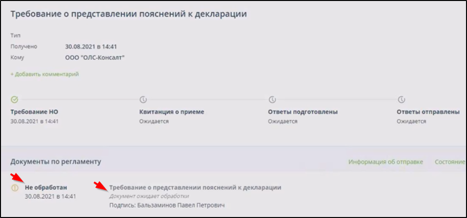 Если поступивший документ не расшифрован, находится в процессе расшифровки или требует для расшифровки входа в систему с использованием другого ключа ЭП, то он отображается с пометками "Не обработан", "Документ ожидает обработки". Пример: