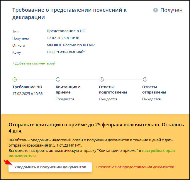Во втором случае для соблюдения регламента ЭДО необходимо нажать кнопку "Уведомить о получении документов" для формирования и отправки в ФНС уведомления о прочтении.