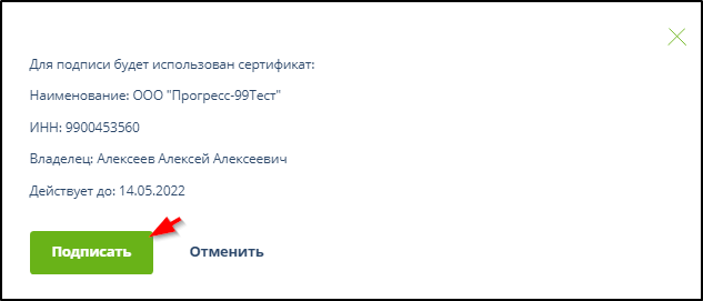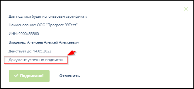 7. На секунду отображается сообщение о подписании и используемом сертификате ключа ЭП. Пример: