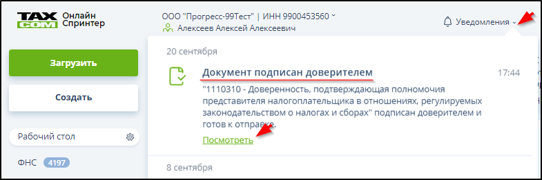 Поступает уведомление о том, что доверенность подписана доверителем и готова к отправке. Для перехода к доверенности можно нажать в этом уведомлении ссылку Посмотреть. Пример: