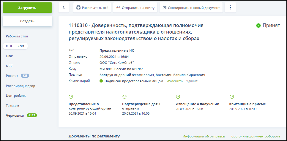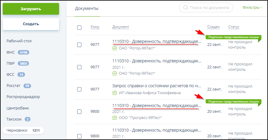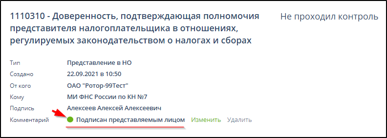 Документ доверенность в разделе Черновики автоматически получает отметку-комментарий Подписан представляемым лицом . Примеры: