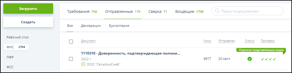 Пример отображения завершенного ЭДО Доверенности в подразделе "ФНС" - "Отправленные" -"Все":