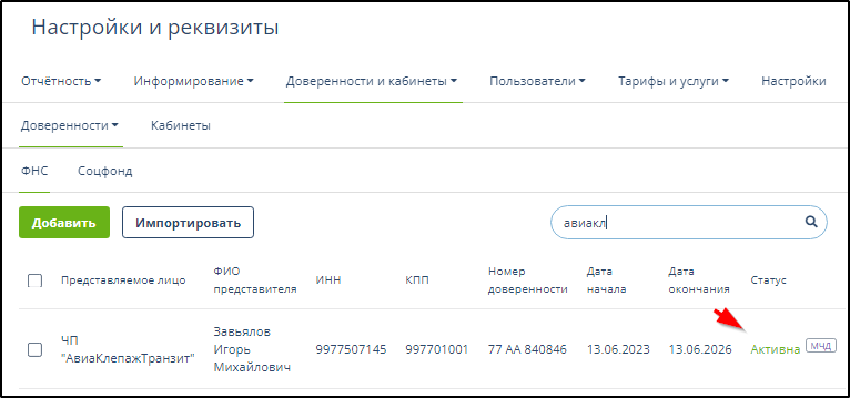 После успешного завершения ЭДО отправки доверенности в ФНС в разделе настроек "Доверенности и кабинеты" автоматически создаётся запись о доверенности с указанием её статуса в колонке "Статус". Пример: